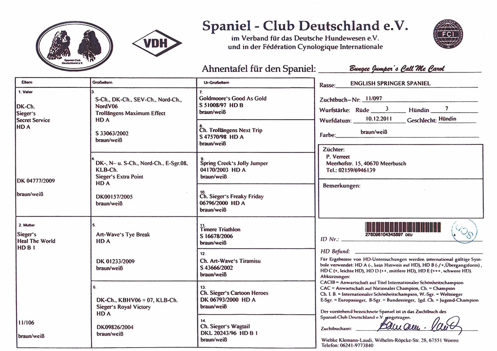 Ahnentafel / Pedigree Ahnentafel von Bungee Jumper`s Call Me Carol "Carol"